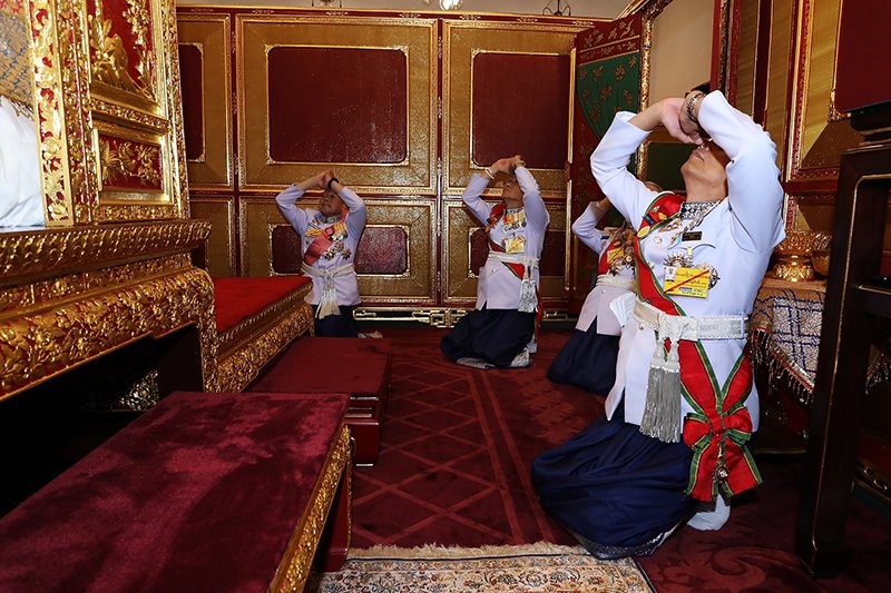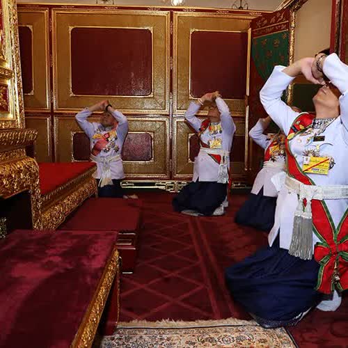| คำอธิบาย : พระบาทสมเด็จพระเจ้าอยู่หัว ทรงประกอบพระราชพิธีเฉลิมพระราชมณเฑียร บรรทมเหนือพระแท่นราชบรรจถรณ์ วันที่ ๔ พฤษภาคม พระบาทสมเด็จพระเจ้าอยู่หัว ทรงฉลองพระองค์เฉลิมพระราชมณเฑียร ทรงพระสังวาลนพรัตน์ราชวราภรณ์ และพระสังวาลพระนพ เสด็จเข้าริ้วขบวนเชิญเครื่องพระราชพิธีเฉลิมพระราชมณเฑียร ริ้วขบวนตั้งแถว ในพระที่นั่งไพศาลทักษิณ หันหน้าทิศตะวันออก พลตำรวจโท วีระชัย กรานคำยี และพลตำรวจเอก ไตรรัตน์ อมาตยกุล เป็นผู้นำเทียน ต่อมาเวลา ๒๐.๐๐ น. พระบาทสมเด็จพระเจ้าอยู่หัว ทรงเครื่องฉลองพระองค์เฉลิมราชมณเฑียร ทรงพระสังวาลนพรัตน์ราชวราภรณ์ พระสังวาลพระนพ พร้อมด้วย สมเด็จพระนางเจ้าฯ พระบรมราชินี เสด็จออกจากพระที่นั่งจักรพรรดิพิมานไปยังพระที่นั่งไพศาลทักษิณ เข้าริ้วขบวนตามผู้นำเทียน พันโท สมชาย กาญจนมณี ถวายขันทองคำพร้อมพานรอง ทรงโปรยเหรียญกษาปณ์ หมุนเวียน รัชกาลที่ ๑๐ ชนิดราคา ๒ บาท พระราชทานตลอดเส้นทางขบวนเสด็จ พระบาทสมเด็จพระเจ้าอยู่หัว และสมเด็จพระนางเจ้าฯ พระบรมราชินี เสด็จลงจากพระที่นั่งไพศาลทักษิณ ออกประตูที่เสด็จลงพระมณฑปพระกระยาสนาน เลี้ยวซ้ายออกทางพระทวารพระมหามณเฑียรกำแพงแก้วด้านตะวันออก เลี้ยวขวาไปตามถนนทรงบาตร เลี้ยวขวาผ่านถนนหลังพระมหามณเฑียร เลี้ยวขวาผ่านพระมหามณเฑียรหมู่กลาง เข้าทางพระทวารพระมหามณเฑียรตะวันตก แล้วนำเสด็จไปตามถนนระหว่างพระที่นั่งจักรพรรดิพิมาน และกำแพงแก้วพระมหามณเฑียรด้านใน เลี้ยวขวาผ่านเก๋งนารายณ์ เข้าพระทวารท้องพระโรงหน้าด้านตะวันตก ผู้นำเทียนหยุดที่ท้องพระโรงหน้า เมื่อเสด็จเข้าท้องพระโรงหน้าขึ้นพระที่นั่งจักรพรรดิพิมานทางอัฒจันทร์ตะวันตก โดยขบวนตามขึ้นไปบนท้องพระโรงกลาง พระบาทสมเด็จพระเจ้าอยู่หัว และสมเด็จพระนางเจ้าฯ พระบรมราชินี ประทับพระราชอาสน์ ท้องพระโรงกลาง พันโท สมชาย กาญจนมณี วางขันทองคำพร้อมพานรองที่โต๊ะบนพระแท่นลด, พันตำรวจเอก ธรรมนิธิ วณิชย์ถนอม เชิญพระแสงดาบคาบค่าย เฝ้า ฯ อยู่ข้างที่ประทับ, ร้อยโท ธนิสร งามพริ้ง เชิญพระสุพรรณศรีบัวแฉก เชิญไปทอดที่บนโต๊ะทองข้างที่ประทับด้านขวา ร้อยโท ฉัตรณรงค์ เรืองพุก เชิญพานพระขันหมากทองคำลงยาองค์ใหญ่เครื่องพร้อม เชิญไปทอดที่บนโต๊ะทองข้างที่ประทับด้านขวา, ร้อยเอก อภิชิต มุกข์โตเกียว เชิญพานพระโอสถไปทอดที่บนโต๊ะทองข้างที่ประทับด้านซ้าย ที่เหลือผู้เชิญนำไปมอบให้ พันโท สมชาย กาญจนมณี ที่พระที่นั่งองค์ตะวันออก เสร็จแล้วกลับมา เฝ้าฯ ที่ท้องพระโรงกลาง พันโท สมชาย กาญจนมณี นำพระ