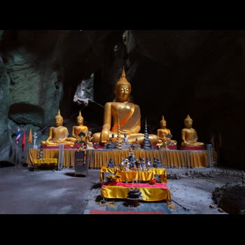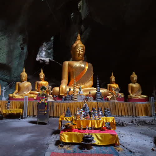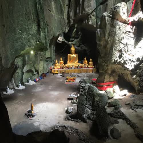 | คำอธิบาย : ถ้ำเหวตากฟ้า : มีระดับความลึกประมาณ 20 เมตร ภายในถ้ำสามารถจุคนได้ประมาณ 1,000 คน ลักษณะภายในถ้ำจะมีปล่องแสงส่องลงมาเพื่อให้ความสว่างภายในถ้ำและอากาศถ่ายเทได้สะดวก โถงภายในถ้ำมีความกว้างไม่คับแคบ มีความสวยงามและน่าอัศจรรย์ เงียบ สงบ ร่มเย็นเหมาะแก่การเจริญวิปัสนากรรมฐาน ซึ่งในสมัยสมเด็จพระเจ้าตากสินมหาราชทรงประทับอยู่จะใช้ประชุมสงฆ์และใช้ในการปฏิบัติวิปัสนากรรมฐาน ทางวัดได้ค้นพบอิฐมอญโบราณและพระพุทธรูปโบราณต่างๆ เช่น พระพุทธรูปทองคำ พระพุทธรูปเงินบุทองเป็นเนื้อเงินยวง เนื้อสำริด ทั้งขนาดเล็กขนาดใหญ่ เป็นจำนวนมากกว่า 1,000 องค์ ค้นพบในถ้ำด้านบนและได้นำมาเก็บในพิพิธภัณฑ์เป็นบางส่วน ปัจจุบันได้สร้างพระพุทธรูปขึ้นเพื่อถวายเป็นพุทธบูชา และใช้ประกอบกิจพิธีกรรมทางพระพุทธศาสนา ซึ่งเป็นพระพุทธรูปปางมารวิชัยเป็นองค์ประธานสูง 9 เมตร เป็นองค์ประธานนามว่าพระพุทธรูปตากสินศรีพรรเพชญ์ธรรมิราชมหาราชา และมีพระพุทธรูป 2 องค์ ด้านซ้ายเป็นพระพุทธรูปองค์ปฐม สูง 5 เมตร ส่วนด้านขวาเป็นพระพุทธรูปเชียงแสน สูง 5 เมตร (ข้อมูลจากแผ่นข้อมูลภายในวัดเขาขุนพนม จังหวัดนครศรีธรรมราช) |