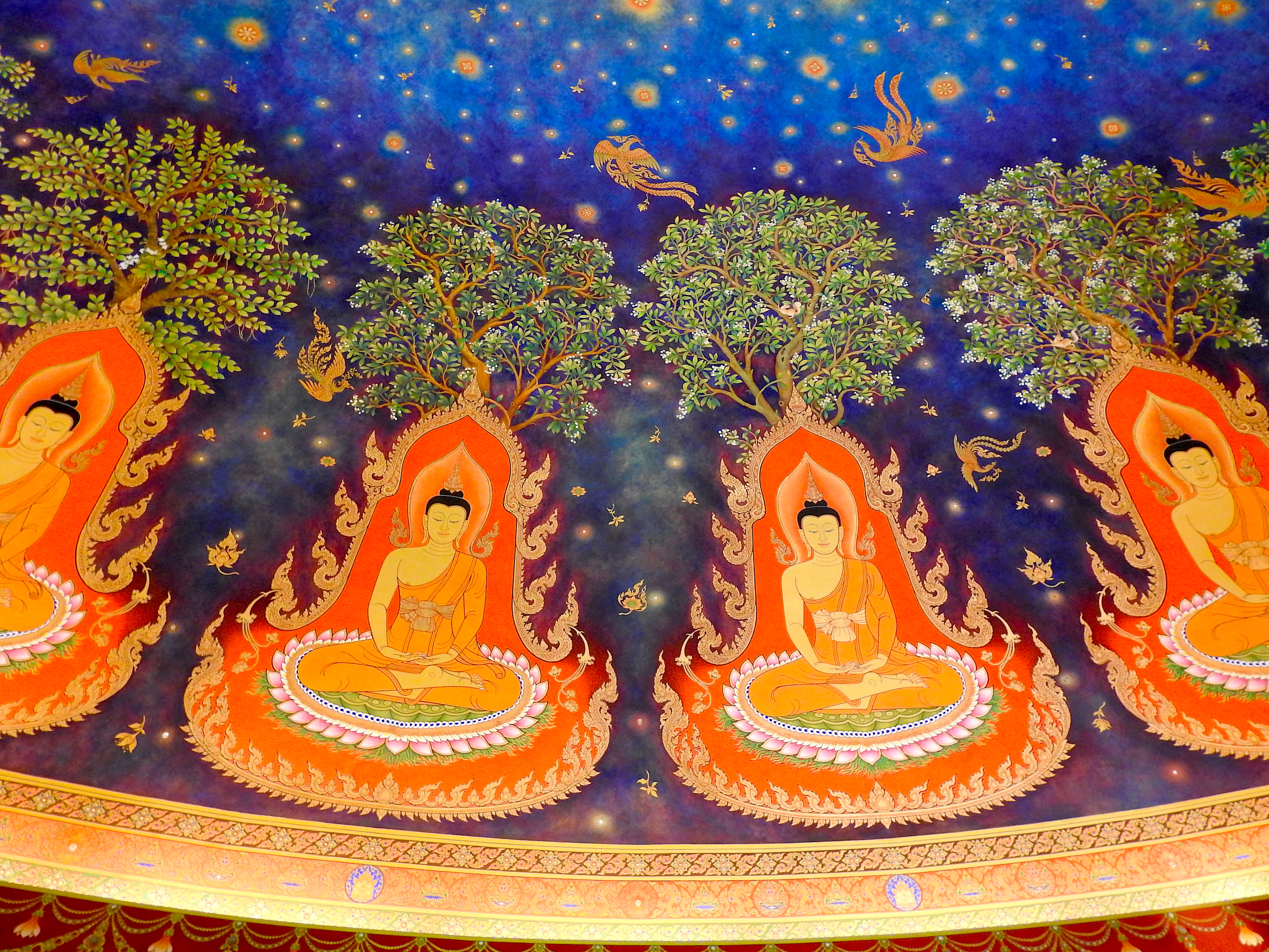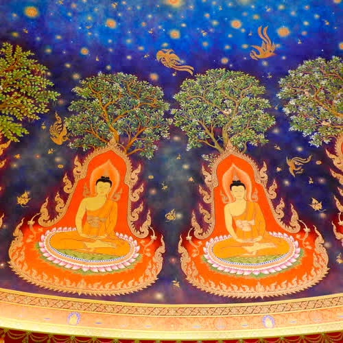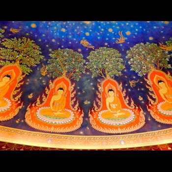 | คำอธิบาย : จิตรกรรมฝาผนังบน ชั้น ๕ พระมหาเจดีย์มหารัชมงคล วัดปากน้ำ ภาษีเจริญ แสดงเรื่องราวของโลกุตรภูมิ ตอนล่างของภาพ เป็นภาพวาดอดีตพระพุทธเจ้า ๒๘ พระองค์ ประทับนั่งขัดสมาธิราบ ภายในซุ้มเรือนแก้ว บนดอกบัว พระหัตถ์แสดงปางสมาธิทุกพระองค์ ประทับนั่งใต้ต้นไม้ที่พระองค์ตรัสรู้อนุตตรสัมมาสัมโพธิญาณ ฯลฯ |