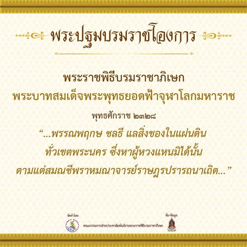 พระปฐมบรมราชโองการ พระราชพิธีบรมราชาภิเษก พระบาทสมเด็จพระพุทธยอดฟ้าจุฬาโลกมหาราช ได้รับใบอนุญาตภายใต้ ให้เผยแพร่-โดยต้องระบุที่มาแต่ห้ามดัดแปลงและห้ามใช้เพื่อการค้า 3.0 Thailand.