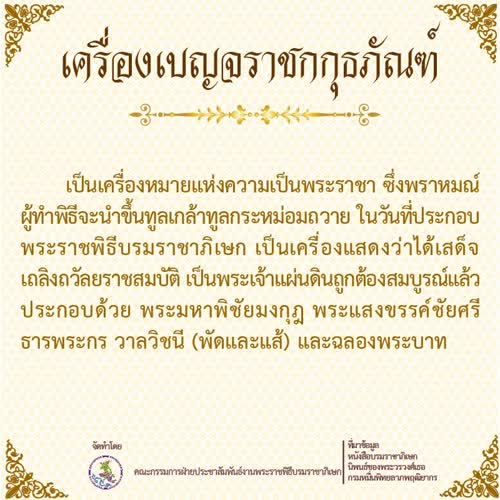 | ชื่อเรื่อง : เครื่องเบญจราชกกุธภัณฑ์ ในพระราชพิธีบรมราชาภิเษก |