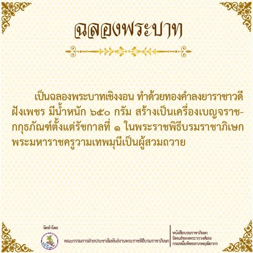| คำสำคัญ : พระราชา, เถลิงถวัลยราชสมบัติ, เครื่องเบญจราชกกุธภัณฑ์, รัชกาลที่ 10, ฉลองพระบาท, พระราชพิธีบรมราชาภิเษก |