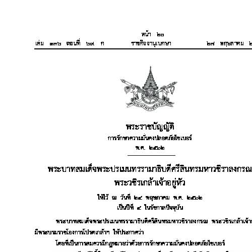 | คำสำคัญ : กฎหมายเศรษฐกิจดิจิทัล, ความมั่นคงปลอดภัยไซเบอร์, ราชกิจจานุเบกษา, พระราชบัญญัติ, พรบ., กฎหมาย |