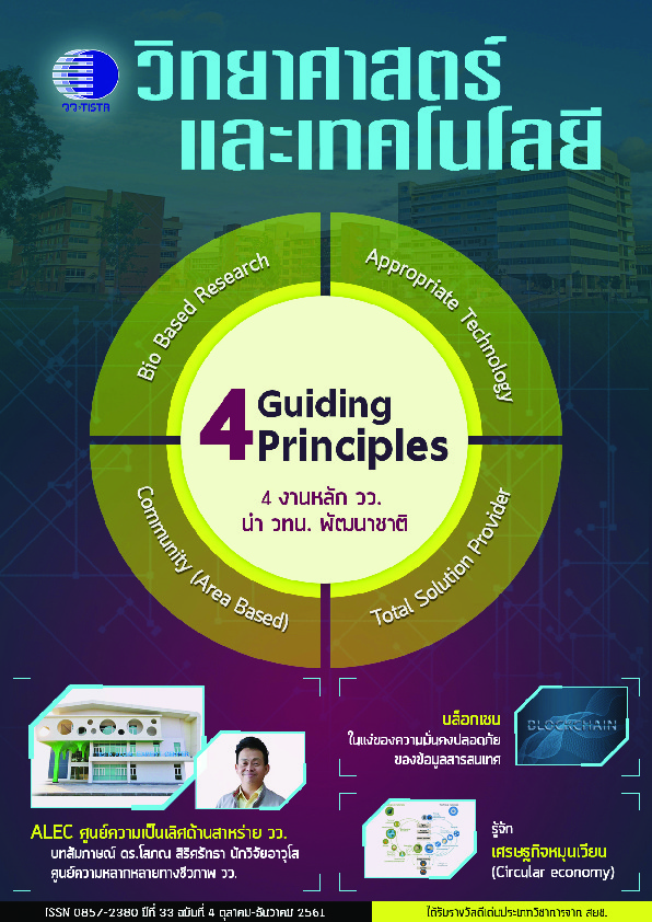 | คำอธิบาย : วารสารวิทยาศาสตร์และเทคโนโลยี ปีที่ 34 ฉบับที่ 1 ม.ค.-มี.ค. 62 4 งานหลัก วว นำ วทน. พัฒนาชาติBio Based ResearchAppropriate TechnologyTotal Solution ProviderCommunity (Area Based) |