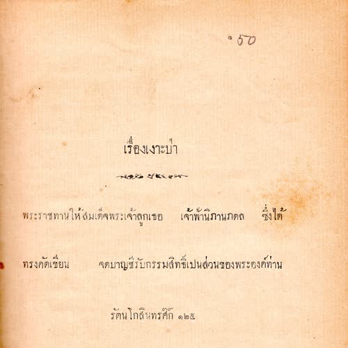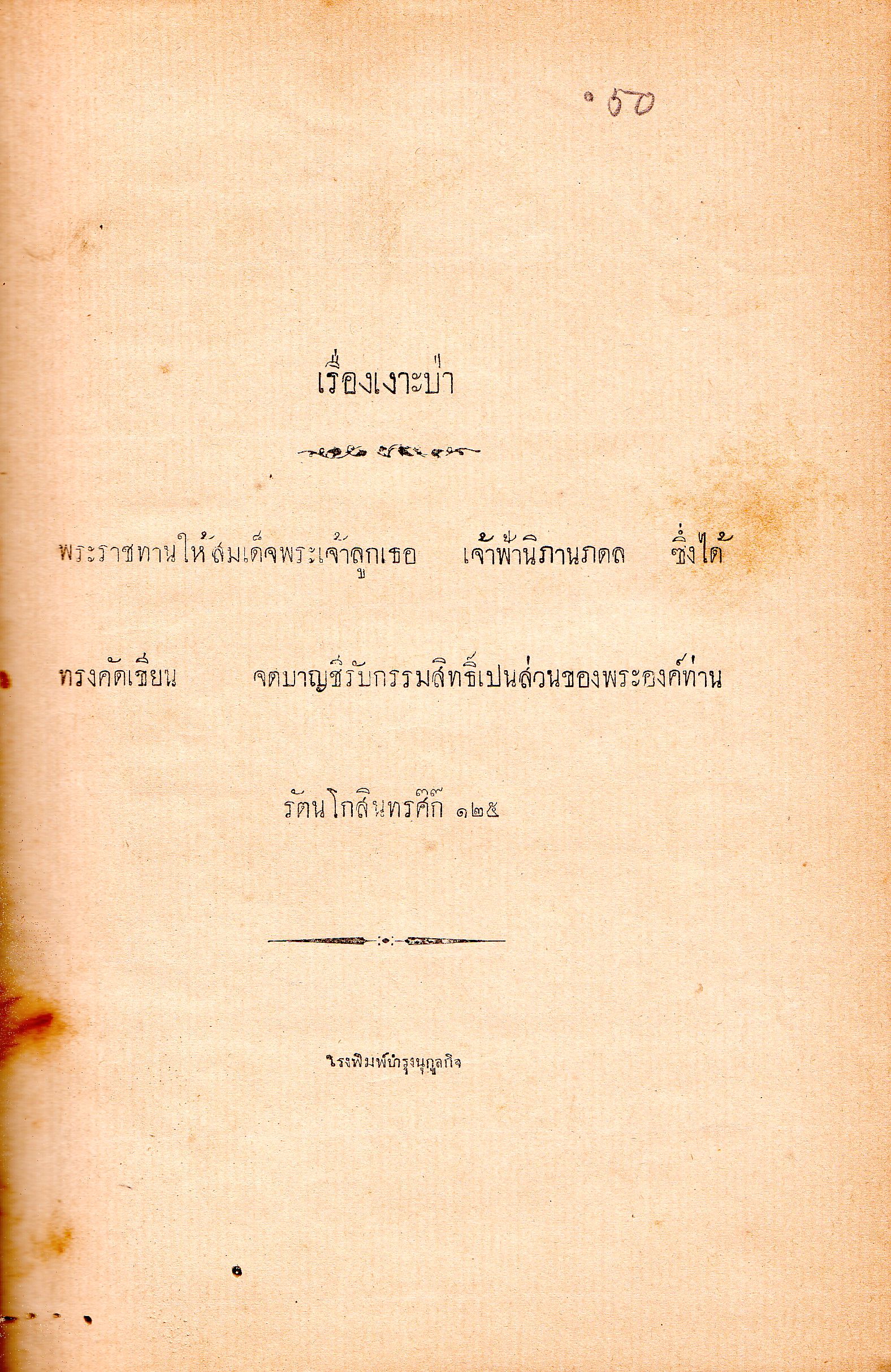 | คำสำคัญ : หนังสือเก่า, ต้นฉบับ, ปกหนังสือ, เจ้าฟ้านิภานภดล, เงาะป่า |