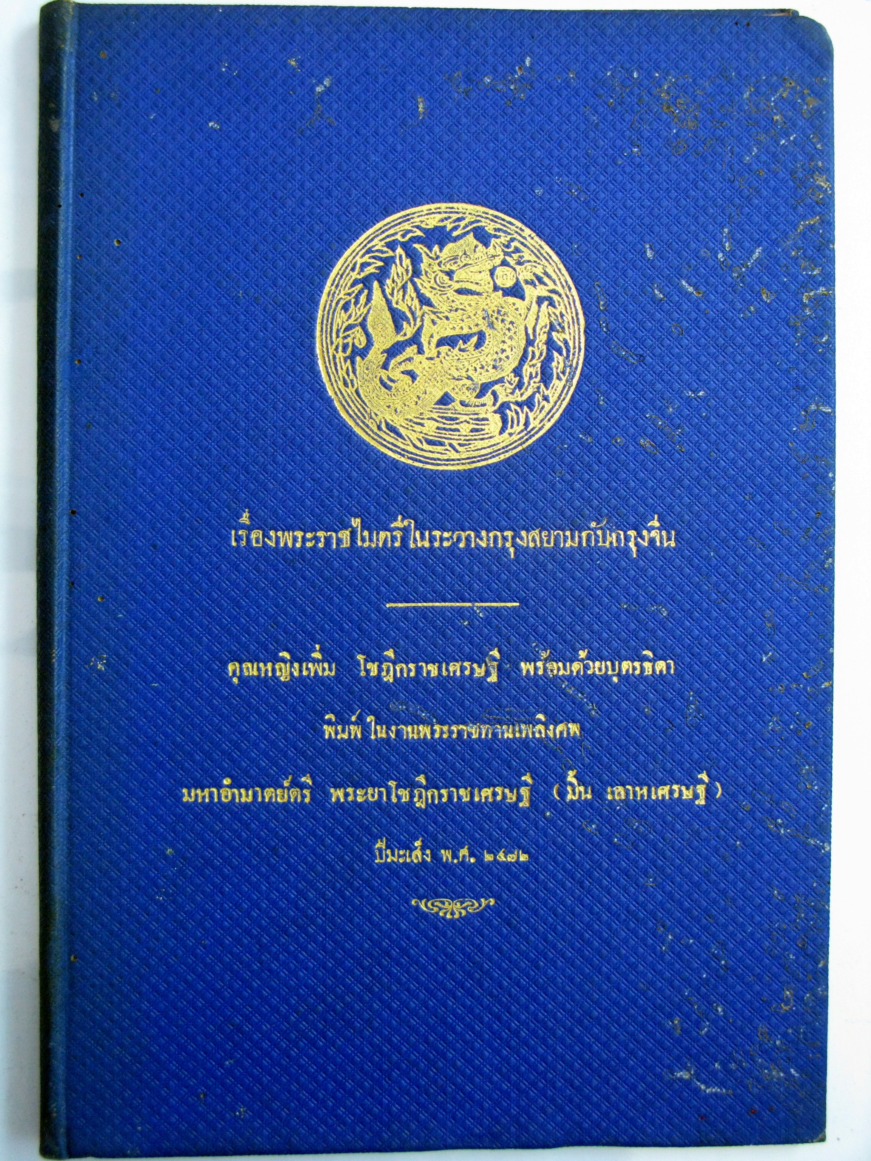 | คำอธิบาย : ปกหนังสือเก่าคุณหญิงเพิ่ม โชฎีกราชเศรษฐี พร้อมด้วยบุตรธิดาพิมพ์ในงานพระราชทานเพลิงศพ มหาอำมาตย์ตรี พระยาโชฎีกราชเศรษฐี (มิ้น เลาหเศรษฐี) ปีมะเส็ง พ.ศ. 2472 |