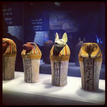 | คำอธิบาย : โถคาโนปิก (Canopic jars) เป็นโถที่ใช้เก็บอวัยวะภายในจากขั้นตอนการทำมัมมี่ (mummification process) โดยโถจะแบ่งออกเป็น 4 ใบ สำหรับเทพเจ้าทั้ง 4 เพื่อดูแลอวัยวะสำคัญของผู้ตาย ดังนี้ คือ Imsety เทพที่มีเศียรเป็นมนุษย์ มีหน้าที่ดูแลตับ, Duamutef เทพที่มีเศียรเป็นสุนัขป่า (Jackal) มีหน้าที่ดูแลกระเพาะ, Hapi เทพที่มีเศียรเป็นลิงบาบูน มีหน้าที่ดูแลปอด และ Qebehsenuef เทพที่มีเศียรเป็นเหยี่ยว มีหน้าที่ดูแลลำไส้ |
