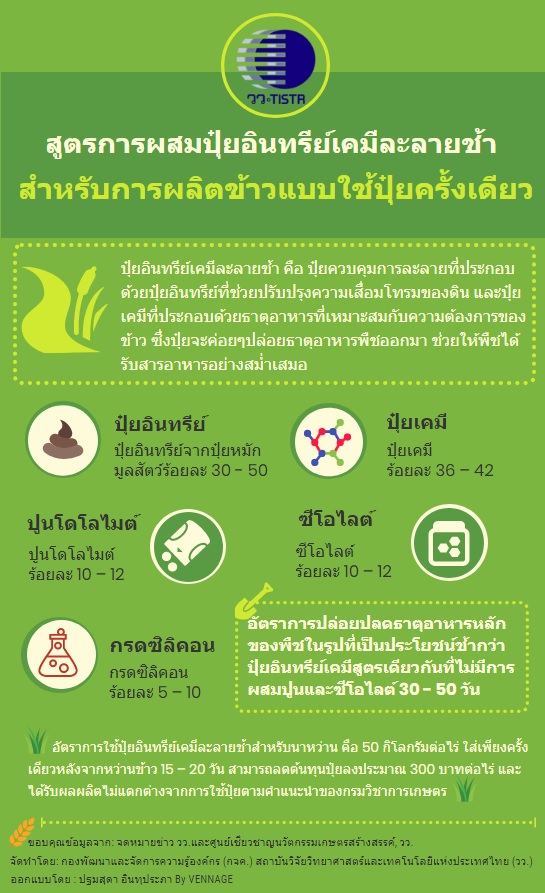 | คำอธิบาย : Infogrphic นี้ เป็นสูตรการผสมปุ๋ยอินทรีย์เคมีละลายช้าสำหรับการผลิตข้าวแบบใช้ปุ๋ยครั้งเดียว |