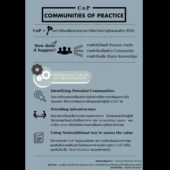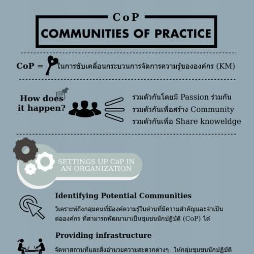 | คำอธิบาย : Infographic นี้เป็นการให้ความรู้เบื้องต้นเกี่ยวกับเรื่องของ CoP ซึ่งเป็นกุญแจสำคัญในกระบวนการจัดการความรู้ (KM) ขององค์กร |