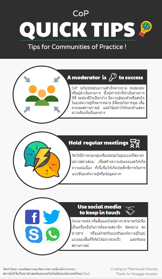 | คำอธิบาย : Infographic นี้เป็น Tips ในการทำ CoP เพื่อใช้เป็นเครื่องมือหนึ่งในการจัดการความรู้ขององค์กร |