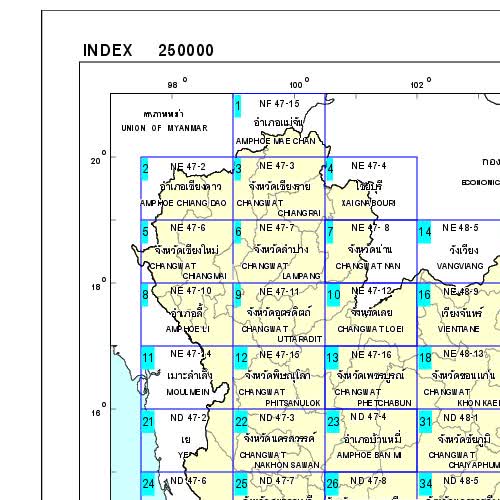 | คำอธิบาย : แผนที่แสดงรายละเอียดของดัชนีแผนที่ทรัพยากรแร่ทั้ง 50 ระวาง ใช้สำหรับการศึกษาในภาพรวมก่อนที่จะศึกษาในรายละเอียดของแต่ละระวางแผนที่ |