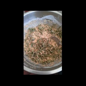 | คำอธิบาย : การผสมใบเล็บครุฑกับแแป้งเพื่อทำกุ้งชุบแป้งทอด |
