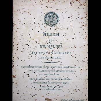 | คำอธิบาย : หนังสือเก่าจาก ห้องสมุดต้นฉบับสถานการณ์ในประเทศลาว 21 กันยายน พ.ศ. 2503คำแถลงของนายกรัฐมนตรี เรื่อง สถานการณ์ในประเทศลาว 21 กันยายน พ.ศ. 2503สำนักนายกรัฐมนตรี |