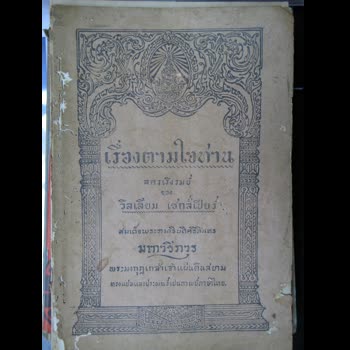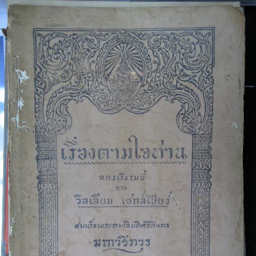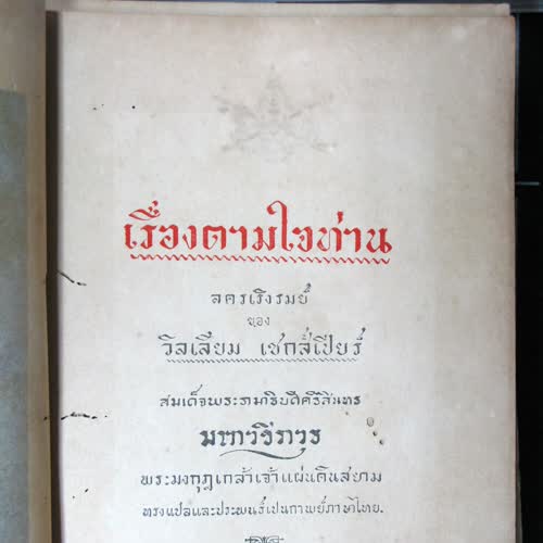 | คำอธิบาย : หนังสือเก่าจาก ห้องสมุดต้นฉบับเรื่องตามใจท่านละครเริงรมย์ ของ วิลเลียม เชกส์เปียร์สมเด็จพระรามาธิบดีศรีสินทรมหาวชิราวุธพระมงกุฎเกล้าเจ้าแผ่นดินสยามทรงแปลและนิพนธ์เป็นกาพย์ภาษาไทย |