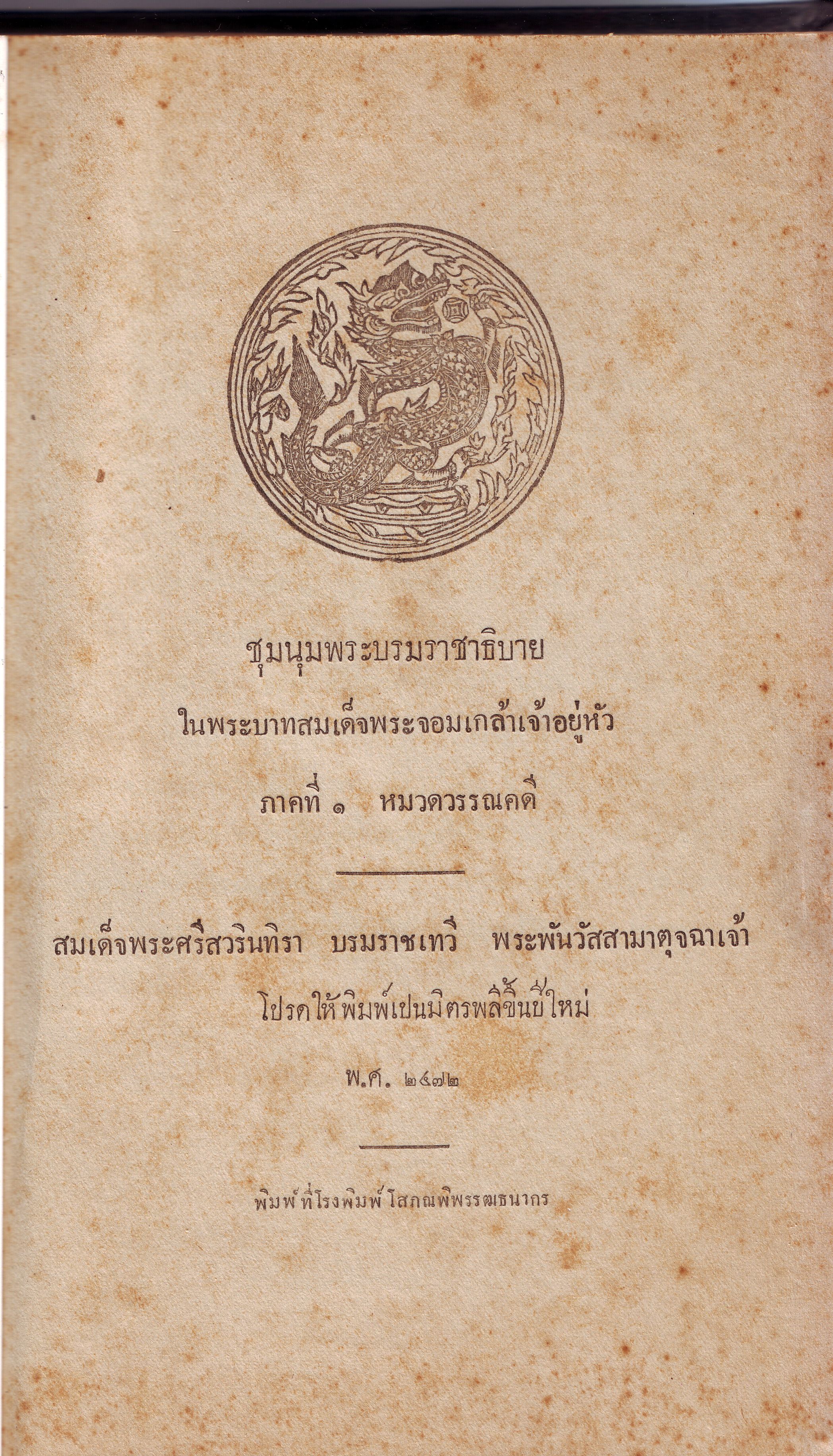 | คำอธิบาย : หนังสือเก่าจาก ห้องสมุดต้นฉบับชุมนุมพระบรมราชาธิบายในพระบาทสมเด็จพระจอมเกล้าเจ้าอยู่หัวภาคที่ 1 หมวดวรรณคดีสมเด็จพระศรีสวรินทิรา บรมราชเทวี พระพันวัสสามาตุจฉาเจ้าโปรดให้พิมพ์เป็นมิตรพลีขึ้นปีใหม่ พ.ศ.2472พิมพ์ที่โรงพิมพ์ โสภณพิพรรฒนากร |