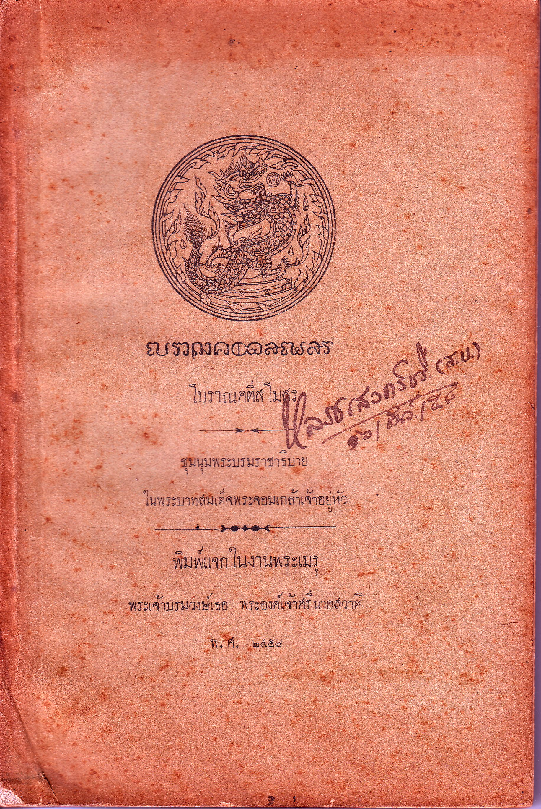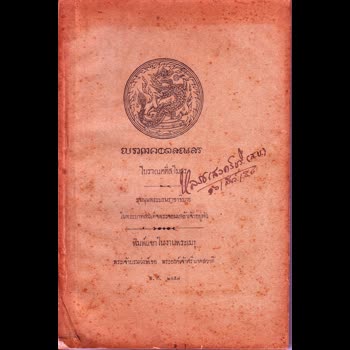 | คำอธิบาย : หนังสือเก่าจาก ห้องสมุดต้นฉบับโบราณคดีสโมสรชุมนุมพระบรมราชาธิบายในพระบาทสมเด็จพระจอมเกล้าเจ้าอยู่หัวพิมพ์แจกในงานพระเมรุพระเจ้าบรมวงษ์เธอ พระองค์เจ้าศรีนาคสวาดิ พ.ศ.2457 |