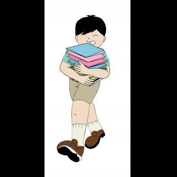 | คำอธิบาย : เด็กชายหอบกองหนังสือ |