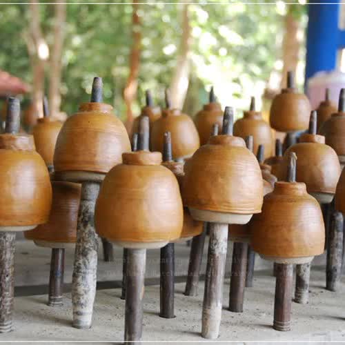 คำอธิบาย : การเคียนผึ้ง หรือ การหุ้มขี้ผึ้ง เป็นขั้นตอนหนึ่งในงานหัตถกรรมเครื่องทองเหลืองบ้านปะอาว จังหวัดอุบลราชธานี โดยนำหุ่นดินที่ผ่านการกลึงและตากแห้งแล้วมาหุ้มด้วยเส้นขี้ผึ้งที่ฉีดออกมาจากบั้งเดียก โดยการพันเรียงเส้นกันให้รอบหุ่นดิน จากนั้นจะทำการกลึงขี้ผึ้งให้เรียบ และตกแต่งลวดลาย โดยใช้ลูกกลิ้งพิมพ์หรือแท่งกดพิมพ์ลายลงไปให้ได้ลวดลาย ตกแต่งหุ่นขี้ผึ้งให้สวยงาม หุ่นขี้ผึ้งมีลวดลายแบบไหน เครื่องทองเหลืองที่ได้ก็จะมีลวดลายเหมือนกัน |