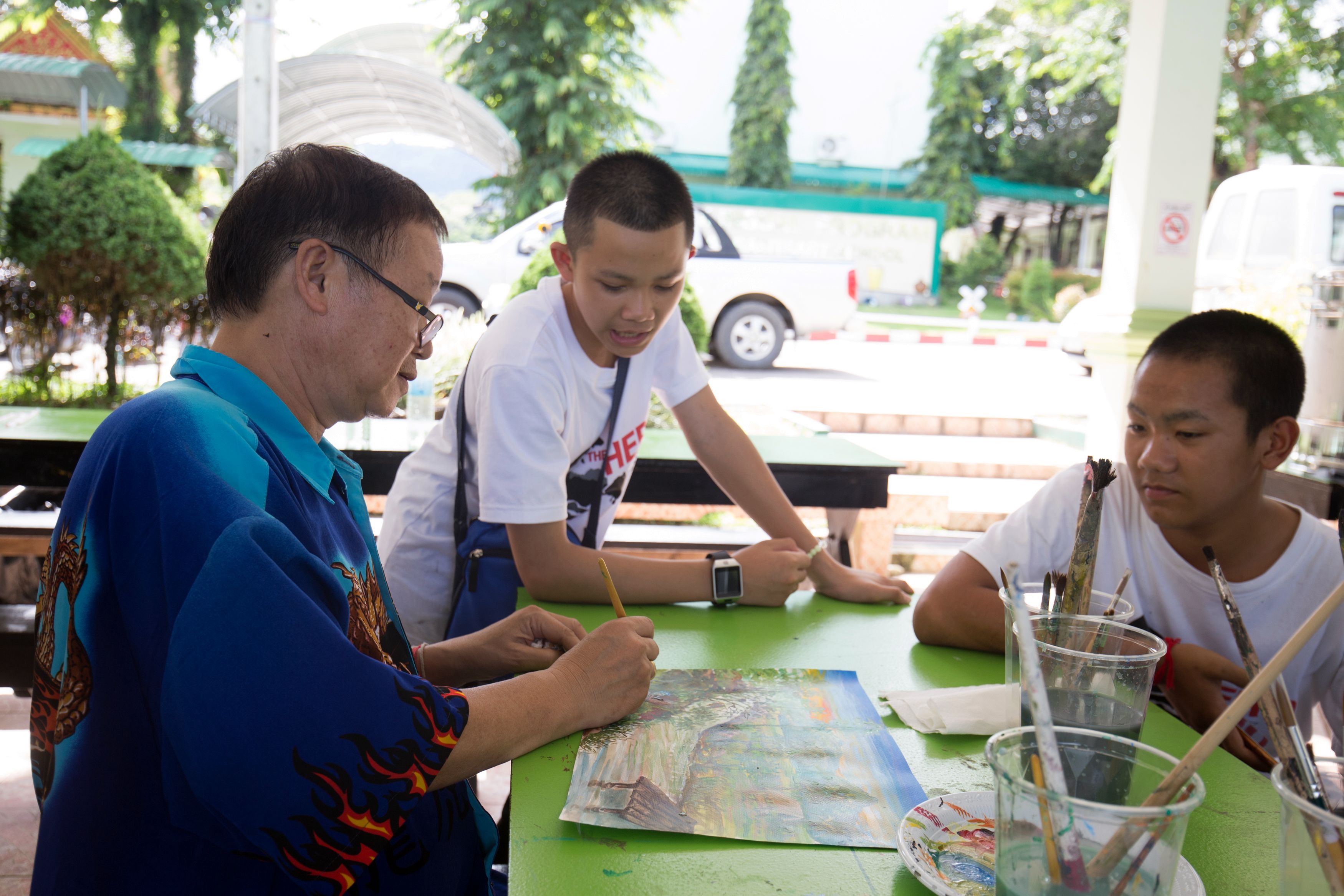(2562). ภาพกิจกรรมสอนน้องหมูป่าวาดรูป กับศิลปินขัวศิลปะ จ.เชียงราย,