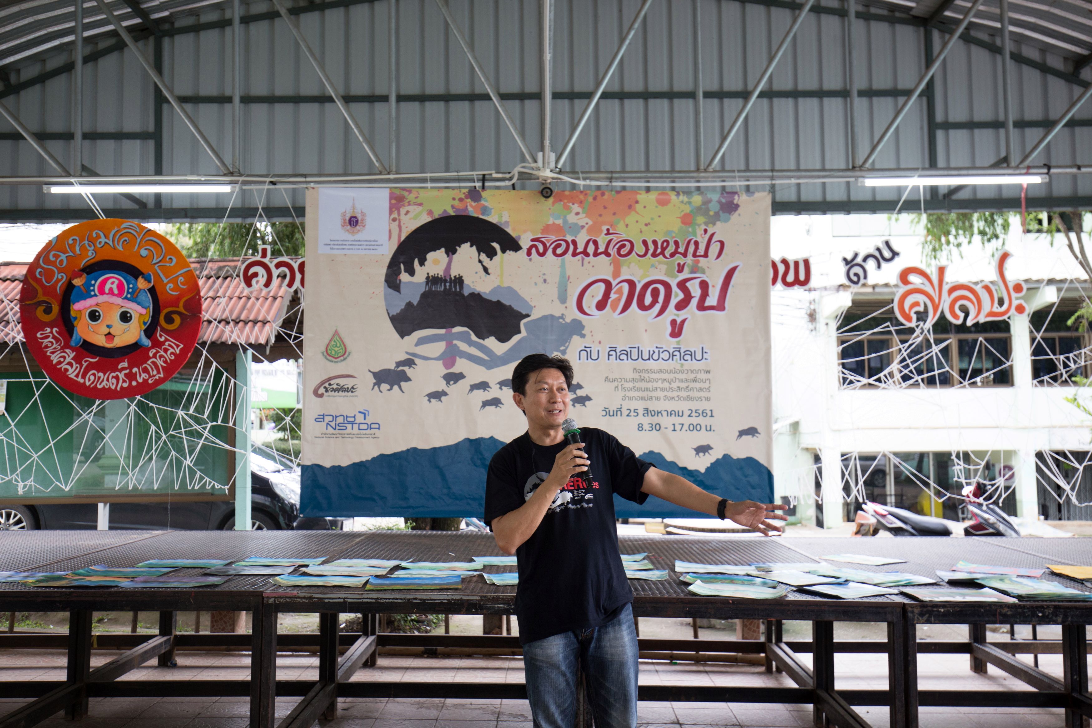 (2562). ภาพกิจกรรมสอนน้องหมูป่าวาดรูป กับศิลปินขัวศิลปะ จ.เชียงราย,