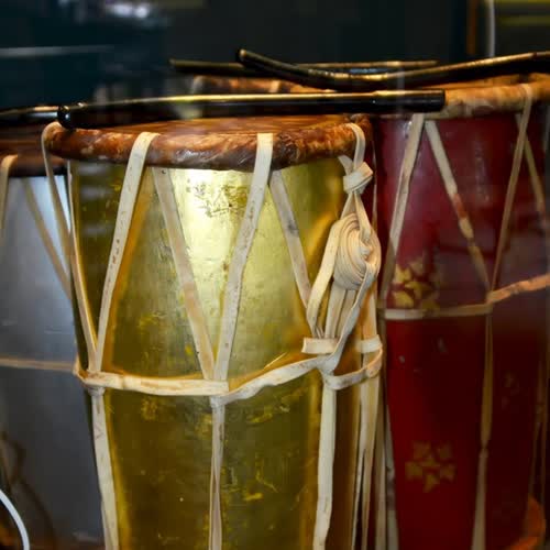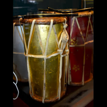 | คำอธิบาย : กลองชนะใช้เป็นเครื่องประโคมในขบวนพยุหยาตราทางชลมารค จัดเป็นเครื่องดนตรีไทยประเภทเครื่องตีให้เกิดเสียงดังชัดเจน ก้องกังวาน ประกอบด้วยตัวกลองและไม้สำหรับตีทำด้วยไม้เช่นไม้ชิงชัน, ไม้ประดู่ด้วยการกลึงและคว้าน ขึงตึงหน้ากลองทั้ง ๒ ด้านด้วยหนังสัตว์ มีสายสำหรับคล้องคอ รัดอกและสายโยงเร่งเสียงใช้สำหรับเร่งเสียงตามระดับเสียงที่ถูกต้องตามแต่ต้องการ ลักษณะคล้ายกับกลองมลายูแต่ตัวกลองชนะสั้นและอ้วนกว่ามาก หน้าด้านของกลองมี ๒ ขนาดคือหน้ากลองด้านใหญ่กว้าง ๒๖ เซนติเมตรและหน้ากลองด้านเล็กกว้าง ๒๔ เซนติเมตร ตัวกลองทรงกระบอกยาว ๕๒ เซนติเมตร มีสายโยงเร่งเสียงโดยใช้หวายผ่าซีกเหมือนกับกลองแขกแต่มีความแตกต่างตรงไม้ที่ใช้ตีที่งอโค้งเหมือนกับกลองมลายูจำนวน ๒ อัน ผิวกลองเรียบสม่ำเสมอ |