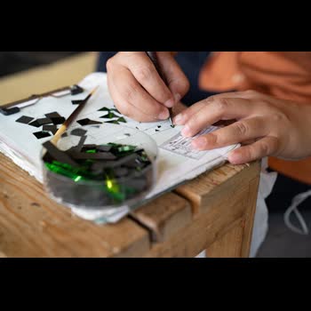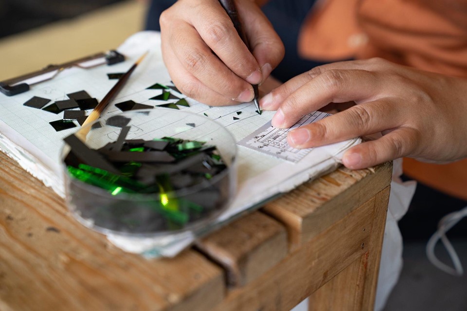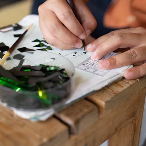 | คำอธิบาย : งานหุงกระจกเป็นศาสตร์แขนงหนึ่งของงานช่างสิบหมู่โบราณ มีความเจริญรุ่งเรืองมาตั้งแต่สมัยพระบาทสมเด็จพระนั่งเกล้าเจ้าอยู่หัว รัชกาลที่ ๓ กระจกดังกล่าวรู้จักกันในชื่อว่า “กระจกเกรียบ” ซึ่งเป็นวัสดุแวววาว ที่วิธีทำเกือบจะเสื่อมสลายไปหมดแล้ว กระจกเกรียบดั้งเดิมนั้นเป็นกระจกสีที่ทำขึ้นมาโดยใช้แร่ดีบุกเป็นพื้นรองรับ จากนั้นจะเคลือบด้วยตัวยาโบราณเช่น ดินประสิว ปากกล้อง กากและแป้ง จึงทำให้ตัวผิวมีความมันวาว ส่วนที่เป็นสีบนผิวกระจกจะใช้ตัวยาซึ่งได้มาจากแร่ธาตุต่างๆ เช่น สีขาว สีแดง สีเขียว สีน้ำเงิน สีเหลือง และมีดีบุกเป็นแผ่นบางๆ รองรับอยู่ข้างล่างทำให้คล้ายแผ่นข้าวเกรียบดิบจึงเรียกกันต่อๆ มาว่ากระจกเกรียบคุณสมบัติเด่นของกระจกชนิดนี้คือ สามารถใช้กรรไกรเล็มกระจกขอบ ๆ ให้เป็นหยดน้ำหรือวงกลมได้ นอกจากนี้ยังช่วยขับเน้นเอกลักษณ์ของความเป็นไทยออกมาผ่านทางสีสันได้อย่างสวยงาม จึงเหมาะสำหรับการนำไปใช้ในงานที่ต้องการประดับลวดลายอันวิจิตร ละเอียดอ่อน สวยงามเช่น ฝาผนัง บุษบก เครื่องราชภัณฑ์ เครื่องใช้ทางศาสนา วัดวาอาราม เรือพระราชพิธีและวัตถุโบราณอันมีค่าอีกมากมายเครื่องมืองานช่างประดับกระจกมีมากมายหลากหลายชนิด ซึ่งแต่ละชนิดก็มีคุณสมบัติแตกต่างกันออกไป ได้แก่๑. เพชรตัดกระจก มีด้ามจับทำด้วยทองเหลือง ลักษณะคล้ายรูปดาบ ความยาวประมาณ ๖ นิ้ว ตอนปลายค่อนข้างแบน ติดเศษเพชรยื่นออกมาเล็กน้อยเรียกว่า "เพชรเขี้ยวงู"๒. ไม้ตับคีบกระจก ทำด้วยไม้ไผ่สำหรับคีบจับแผ่นกระจกได้มั่นและตัดกระจก ซึ่งให้ความสะดวกแก่ช่าง |