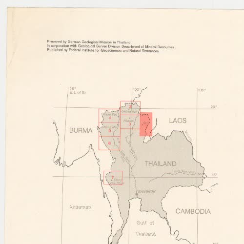 | คำอธิบาย : โครงการความร่วมมือระหว่างประเทศไทยกับสหพันธ์สาธารณรัฐเยอรมนีได้เริ่มขึ้นเมื่อปี พ.ศ. 2508 ทำการสำรวจธรณีวิทยาในบริเวณภาคเหนือ และภาคตะวันตกบางส่วน จนสิ้นสุดโครงการในปี พ.ศ. 2514 Geological Map of Northern Thailand 1:250000 Sheet Nan 1975 |