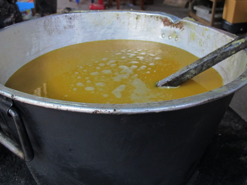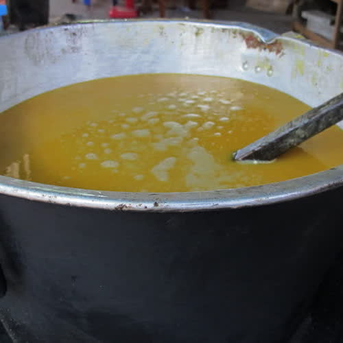 | คำอธิบาย : การต้มขี้ผึ้ง สำหรับการทำต้นเทียนพรรษาประเภทติดพิมพ์ของจังหวัดอุบลราชธานีเพื่อนำไปทำขี้ผึ้งแผ่นพิมพ์ลาย จะนำขี้ผึ้งแท้มาสับเป็นก้อนเล็ก ๆ ต้มในชามขนาดใหญ่หรือปี๊บ ใส่น้ำลงไปเล็กน้อยเพื่อป้องกันการไหม้และทำให้ขี้ผึ้งสะอาดขึ้น ระหว่างต้มหมั่นคนเพื่อให้เทียนละลายเร็วและป้องกันการไหม้ เมื่อละลายดีแล้วยกลง ใช้กระบวยกรองขี้ผึ้งลงในชามขนาดเล็กโดยใส่น้ำเล็กน้อย เศษฝุ่นละอองที่ปะปนจะตกตะกอนลงในน้ำ ทิ้งให้ขี้ผึ้งแข็งตัวพอหมาด ๆ จึงนำไปพิมพ์ดอกผึ้ง |
