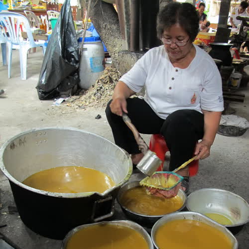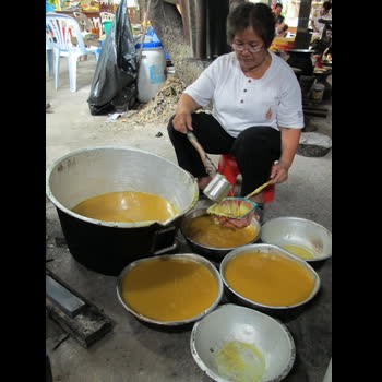 | คำอธิบาย : การกรองขี้ผึ้ง จะเป็นวิธีการที่จะช่วยทำความสะอาดขี้ผึ้งเหลวให้สะอาด ในขั้นตอนการเตรียมขี้ผึ้งสำหรับนำไปพิมพ์ลวดลายในการทำต้นเทียนพรรษาประเภทติดพิมพ์ของจังหวัดอุบลราชธานี โดยใช้กระบวยตักขี้ผึ้งเหลวให้ไหลผ่านผ้ากรองลงไปในชามขนาดเล็กที่ใส่น้ำไว้เล็กน้อย เศษฝุ่นละอองที่ปะปนจะตกตะกอนลงในน้ำ ก่อนนำไปพิมพ์ลายจะทิ้งให้ขี้ผึ้งแข็งตัวพอหมาด ๆ จึงนำไปพิมพ์ลายสำหรับทำดอกผึ้งต่อไป |