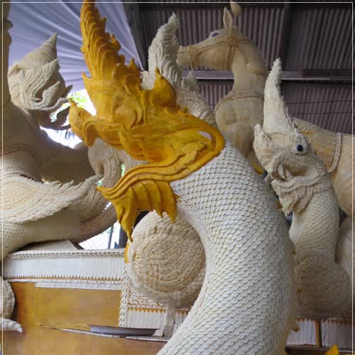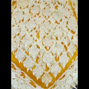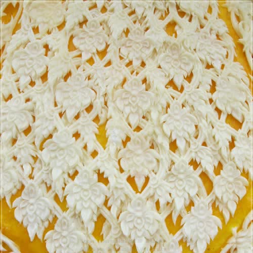 | คำอธิบาย : การติดดอกผึ้ง เป็นขั้นตอนสำคัญในการทำต้นเทียนพรรษาประเภทติดพิมพ์ของจังหวัดอุบลราชธานี โดยการนำดอกผึ้งที่ตัดลายเรียบร้อยแล้วไปติดตามฐาน ลำต้น ยอดของต้นเทียน และหุ่นองค์ประกอบต่าง ๆ ตามการออกแบบของช่างเทียน การติดดอกผึ้งจะต้องอาศัยความชำนาญของช่างเทียน เพื่อให้ลวดลายมีความต่อเนื่อง มีจังหวะที่สวยงามลงตัว ต้นเทียนพรรษาจะสวยงามมากน้อยแค่ไหนนอกจากจะขึ้นกับความละเอียดอ่อนช้อยของลวดลายแล้ว จังหวะการวางลวดลาย ความต่อเนื่องของลวดลายก็เป็นปัจจัยหนึ่งที่ทำให้ต้นเทียนสวยงามซึ่งต้องอาศัยฝีมือของช่างทำต้นเทียน |