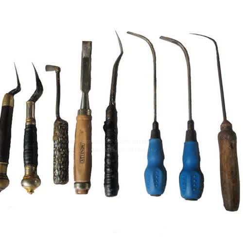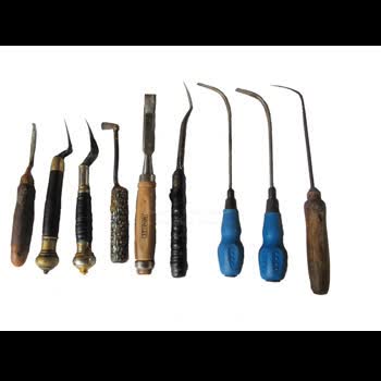 | คำอธิบาย : อุปกรณ์สำหรับแกะสลักต้นเทียนพรรษาของจังหวัดอุบลราชธานี ประกอบด้วย มีด ใช้สำหรับตัด เจาะ ขีด หรือแกะสลักขี้ผึ้งหรือต้นเทียนให้เกิดลวดลาย มีหลายขนาด ตะขอเหล็ก ใช้สำหรับเจาะ หรือขูดขี้ผึ้งในบริเวณแคบ ๆ เหล็ดขูด ใช้สำหรับขูดผิวขี้ผึ้งหรือต้นเทียนให้เรียบ สิ่ว ใช้สำหรับเจาะ เซาะขี้ผึ้งหรือต้นเทียนทำให้เกิดลวดลาย มีหลายรูปแบบ เช่น ปลายตัดตรง ปลายตัดโค้ง ปลายตัดเฉียง |