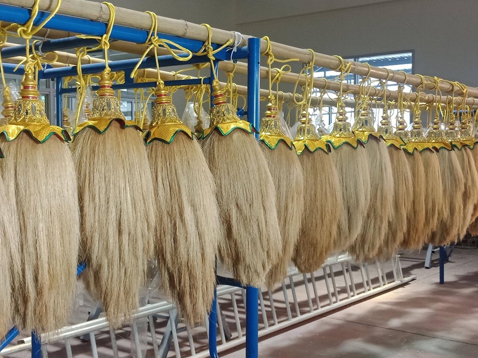 | คำอธิบาย : พู่ประจำเรือดั้ง เรือแซง เรือตำรวจ เรืออีเหลือง เรือแตงโม เรือทองขวานฟ้า เรือทองบ้าบิ่น ทำจากเชือกป่านมะนิลาที่สั่งซื้อมาจากจีน ความยาวประมาณเส้นละ ๕๐ เซ็นติเมตร นำมาเย็บบุกับนวมทรงหยดน้ำ เย็บวนจากล่างขึ้นบนซ้อนทับกันประมาณ ๗-๑๐ ชั้น |