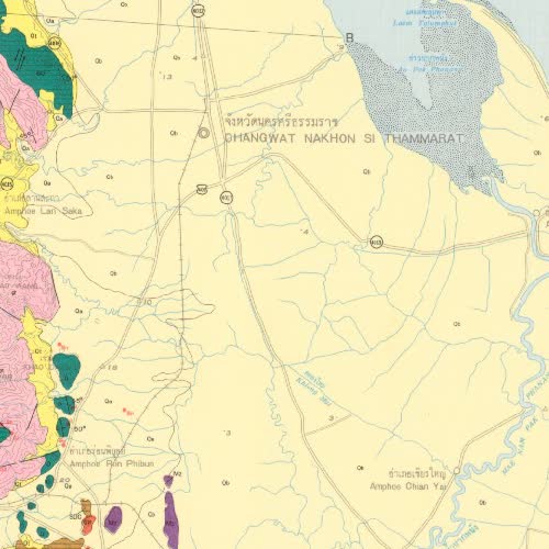 แผนที่ธรณีวิทยามาตราส่วน 1:250,000 NC 47-15 ระวางจังหวัดนครศรีธรรมราช ได้รับใบอนุญาตภายใต้ ให้เผยแพร่-โดยต้องระบุที่มาแต่ห้ามดัดแปลงและห้ามใช้เพื่อการค้า 3.0 Thailand.