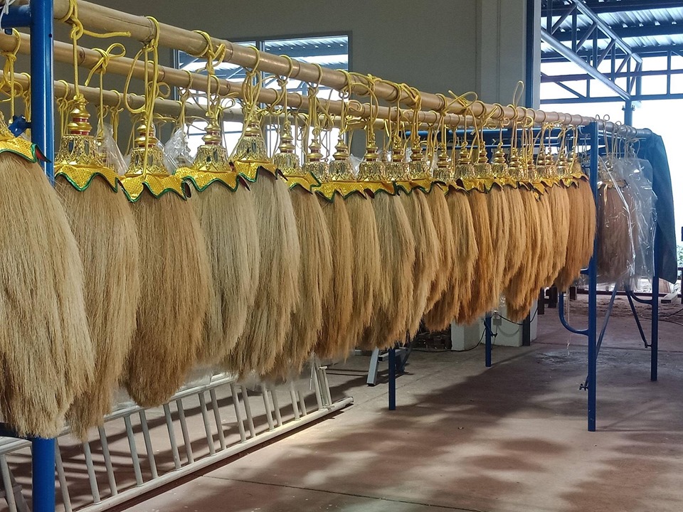 | คำอธิบาย : พู่ประจำเรือดั้ง เรือแซง เรือตำรวจ เรืออีเหลือง เรือแตงโม เรือทองขวานฟ้า เรือทองบ้าบิ่น ทำจากเชือกป่านมะนิลาที่สั่งซื้อมาจากจีน ความยาวประมาณเส้นละ ๕๐ เซ็นติเมตร นำมาเย็บบุกับนวมทรงหยดน้ำ เย็บวนจากล่างขึ้นบนซ้อนทับกันประมาณ ๗-๑๐ ชั้น |