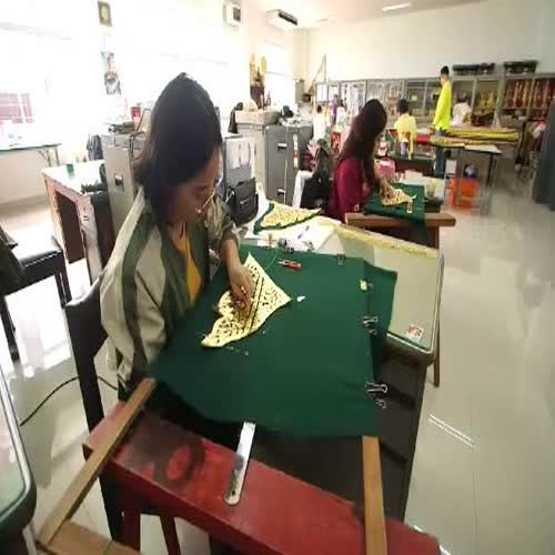 | คำอธิบาย : ขั้นตอนงานผ้าลายทองแผ่ลวด (ธงสามชายเล็กสำหรับเรือรูปสัตว์ ๖ ลำ) เริ่มจากช่างจะตอกฉลุกระดาษตามลวดลายที่เขียนไว้ จากนั้นทาด้วยแชล็คลงบนลวดลาย ทิ้งให้แห้งแล้วทาทับด้วยสีน้ำมันและปิดทับด้วยทองคำเปลวแท้ ๑๐๐%จากนั้นประดับกระจกเป็นแววจากด้านหลัง นำลายทองแผ่ลวดมาเย็บติดกับผืนผ้า ซึ่งจะต้องใช้ความระมัดระวังในการเย็บหรือปักเป็นพิเศษ เนื่องจากกระดาษมีความบางขาดง่าย ซึ่งเป็นลักษณะงานประณีตศิลป์ |