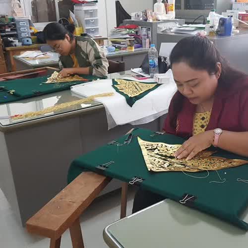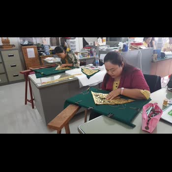 | คำอธิบาย : ขั้นตอนงานผ้าลายทองแผ่ลวด (ธงสามชายเล็กสำหรับเรือรูปสัตว์ ๖ ลำ) เริ่มจากช่างจะตอกฉลุกระดาษตามลวดลายที่เขียนไว้ จากนั้นทาด้วยแชล็คลงบนลวดลาย ทิ้งให้แห้งแล้วทาทับด้วยสีน้ำมันและปิดทับด้วยทองคำเปลวแท้ ๑๐๐%จากนั้นประดับกระจกเป็นแววจากด้านหลัง นำลายทองแผ่ลวดมาเย็บติดกับผืนผ้า ซึ่งจะต้องใช้ความระมัดระวังในการเย็บหรือปักเป็นพิเศษ เนื่องจากกระดาษมีความบางขาดง่าย ซึ่งเป็นลักษณะงานประณีตศิลป์ |