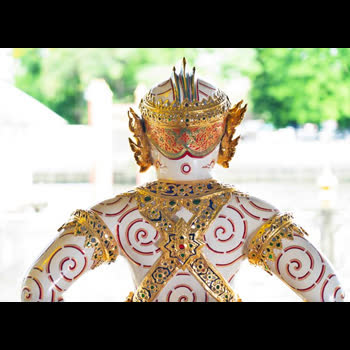 | คำอธิบาย : ลักษณะของโขนเรือกระบี่ปราบเมืองมาร กายและใบหน้าสีขาวกระบังหรือขาวเผือก เป็นหน้าวานรประเภทปากอ้าหัวโล้น สวมศิราภรณ์ (เครื่องประดับหัว) เกี้ยวหรือมาลัยทอง, มาลัยรักร้อย มีผ้าโพกตะบิดเป็นเกลียว ทับจอนหู กรรเจียกจร (จอนหู) อุบะและกุณฑล (ตุ้มหู)สัดส่วนต่าง ๆ บนใบหน้านูนเด่นคมชัด ประกอบด้วยหนวดสีเขียว หางคิ้วที่ได้ระดับกับหนวดและริมฝีปาก แก้วตาสีทอง นัยน์ตาสีดำ ขอบตาสีขาว ปากอ้ากว้าง เขี้ยวสีขาวงาช้างขนาดเล็กสีขาว ๔ เขี้ยว เพดานปากและลิ้นสีแดงชาดชาด มีเขี้ยวแก้วลอยเด่นอยู่กลางเพดานปาก ใบหน้าเชิดอย่างองอาจสง่างาม |