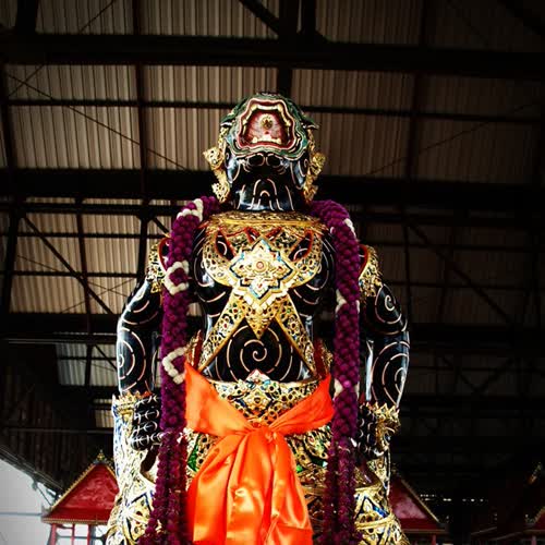 | คำอธิบาย : ลักษณะของโขนเรือกระบี่ราญรอนราพณ์ กายและใบหน้าสีเขม่าหรือสีดำน้ำรัก เป็นหน้าวานรประเภทปากอ้าหัวโล้น สวมศิราภรณ์ (เครื่องประดับหัว) เกี้ยวหรือมาลัยทอง, มาลัยรักร้อย มีผ้าโพกตะบิดเป็นเกลียว ทับจอนหู กรรเจียกจร (จอนหู) อุบะและกุณฑล (ตุ้มหู)สัดส่วนต่าง ๆ บนใบหน้านูนเด่นคมชัดประกอบด้วยหนวดสีเขียว หางคิ้วที่ได้ระดับกับหนวดและริมฝีปาก แก้วตาสีทอง นัยน์ตาสีดำ ขอบตาสีทอง ปากอ้ากว้าง เขี้ยวสีทองขนาดเล็ก ๔ เขี้ยว เพดานปากและลิ้นสีแดงชาดชาดมีเขี้ยวแก้วลอยเด่นอยู่กลางเพดานปากเช่นเดียวกับหนุมาน ใบหน้าเชิดอย่างองอาจสง่างาม |