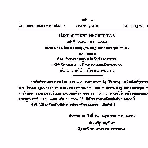 | คำอธิบาย : มอก. 2604 เล่ม 1 – 2557 มาตรฐานผลิตภัณฑ์อุตสาหกรรมการให้บริการและแลกเปลี่ยนสารสนเทศเพื่อการจราจร – เล่ม 1 เกณฑ์วิธีการร้องขอและตอบกลับ ประกาศ วันที่ 9 กรกฎาคม พ.ศ. 2557 |