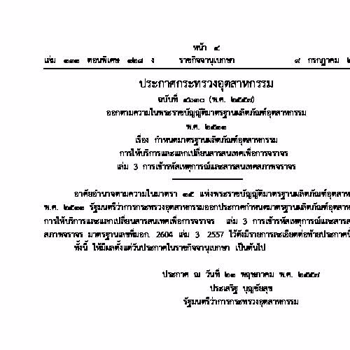 | คำอธิบาย : มอก. 2604 เล่ม 3 – 2557 มาตรฐานผลิตภัณฑ์อุตสาหกรรมการให้บริการและแลกเปลี่ยนสารสนเทศเพื่อการจราจร – เล่ม 3 การเข้ารหัสเหตุการณ์และสารสนเทศสภาพจราจร ประกาศ วันที่ 9 กรกฎาคม พ.ศ. 2557 |