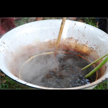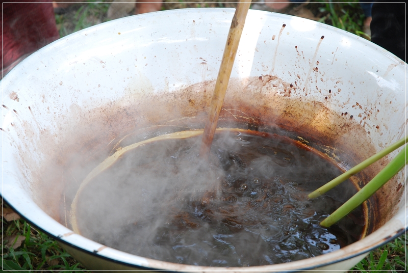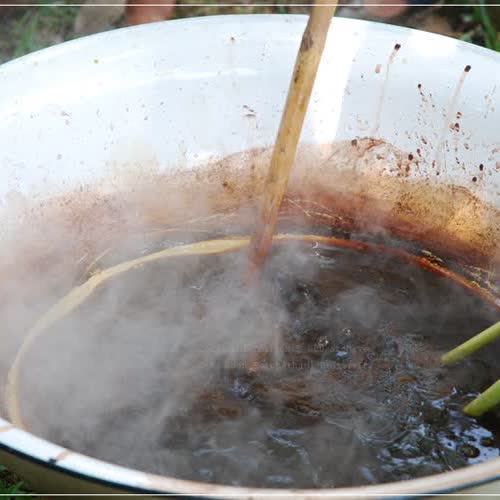 | คำอธิบาย : การย้อมเส้นไหมด้วยขมิ้น จะได้เส้นไหมสีเหลือง โดยจะเริ่มจากการหมักน้ำขมิ้นไว้ค้างคืน จากนั้นนำน้ำหมักไปต้ม ใช้ไฟปานกลาง นำเส้นไหมไปแช่ในน้ำสารส้มก่อนนำมาย้อม เพื่อให้มีสภาพเป็นด่างซึ่งจะทำให้ติดสีได้ดีขึ้น จากนั้นจึงนำปอยไหมลงไปย้อมในน้ำย้อม ถ้าย้อมนานสีก็จะเข้มขึ้นเรื่อย ๆ การย้อมแต่ละครั้งต้องเตรียมเส้นไหมที่ต้องการใช้ให้เพียงพอ และทำการย้อมสีพร้อมกัน จึงจะได้เส้นไหมที่มีสีเดียวกัน |