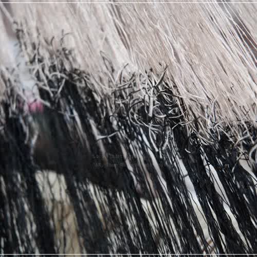 | คำอธิบาย : การสืบหูก เป็นขั้นตอนในการเตรียมเส้นไหมสำหรับทอ เมื่อค้นหูกได้จำนวนเส้นไหมตามที่ต้องการแล้ว จะการต่อเส้นไหมที่ค้นและตัดปลายแล้วเข้ากับไส้หูกที่ติดอยู่กับเขาหูกและฟืมที่ค้นทอผ้าผืนที่แล้วเหลือค้างไว้กับฟืมและเขาหูก โดยจะผูกปลายเส้นไหมจากไส้หูกอันใหม่เข้ากับปลายเส้นไหมจากไส้หูกเดิมที่ติดอยู่กับเขาหูกทีละคู่ เรียงลำดับก่อนหลังของเส้นไหมให้ถูกต้อง โดยสังเกตลำดับจากการขัดกันของเส้นไหมที่ทำไว้ที่ขาไจ ผูกทีละคู่ไปเรื่อย ๆ จนหมด หากผูกข้ามเส้นจะมีเส้นไหมเหลืออยู่ หากผูกผิดลำดับ เวลาทอจะพุ่งกระสวยไม่ได้ |