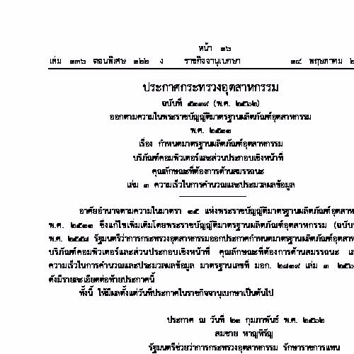 | คำอธิบาย : มาตรฐานผลิตภัณฑ์อุตสาหกรรม 2819 เล่ม 3 – 2561 มาตรฐานผลิตภัณฑ์อุตสาหกรรมบริภัณฑ์คอมพิวเตอร์และส่วนประกอบเชิงหน้าที่ – คุณลักษณะที่ต้องการด้านสมรรถนะ – เล่ม 3 ความเร็วในการคำนวณและประมวลผลข้อมูล ประกาศ วันที่ 21 กุมภาพันธ์ พ.ศ. 2562 |