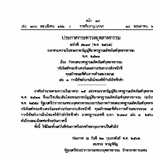 | คำอธิบาย : มาตรฐานผลิตภัณฑ์อุตสาหกรรม 2819 เล่ม 1 – 2561 มาตรฐานผลิตภัณฑ์อุตสาหกรรม บริภัณฑ์คอมพิวเตอร์และส่วนประกอบเชิงหน้าที่ – คุณลักษณะที่ต้องการด้านสมรรถนะ – เล่ม 1 การใช้พลังงานในโหมดใช้กำลังไฟฟ้าต่ำ ประกาศ วันที่ 21 กุมภาพันธ์ พ.ศ. 2562 |