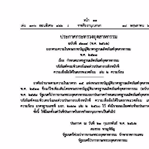 | คำอธิบาย : มาตรฐานผลิตภัณฑ์อุตสาหกรรม 2791 เล่ม 2 – 2560 มาตรฐานผลิตภัณฑ์อุตสาหกรรม บริภัณฑ์คอมพิวเตอร์และส่วนประกอบเชิงหน้าที่ – เฉพาะด้านความเชื่อถือได้ในสภาพแวดล้อม – เล่ม 2 ความร้อน ประกาศ วันที่ 21 กุมภาพันธ์ พ.ศ. 2562 |