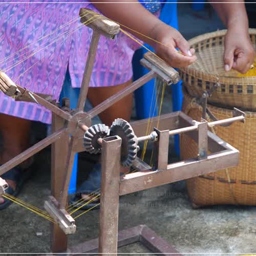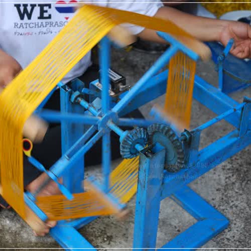 | คำอธิบาย : เหล่ง หรือ เครื่องทำไจหรือปอยไหม เป็นอุปกรณ์ใช้ในงานหัตถกรรมการทอผ้าไหม เมื่อสาวไหมเสร็จแล้ว ก่อนนำไปผึ่งลมให้แห้ง จะนำเส้นไหมไปกรอทำเข็ดไหมหรือไจไหมก่อนด้วยเครื่องทำไจไหม โดยแยกเส้นไหมออกเป็นชนิด ๆ เช่น ไหมหลืบ ไหมสาวเลย หรือไหมน้อย เครื่องทำไจไหม หรือเหล่ง จะมีลักษณะเป็นวงล้อ มีที่จับหมุนเพื่อพันเก็บเส้นไหมไม่ให้พันกัน มีขนาดมาตรฐาน คือ เส้นรอบวง 150 เซนติเมตร เมื่อทำเป็นไจแล้วจะได้เส้นไหมหนักใจละประมาณ 100 กรัม |