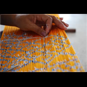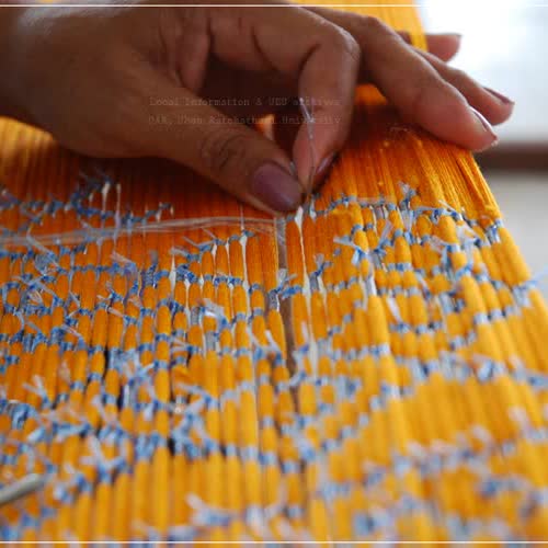 | คำอธิบาย : การมัดหมี่ เป็นขั้นตอนในการสร้างลวดลายของผ้าไหม ในงานหัตถกรรมการทอผ้าไหม เมื่อทำการค้นหมี่หรือทำเส้นพุ่งตามจำนวนที่ออกแบบไว้เรียบร้อยแล้ว ให้นำเส้นไหมนั้นสวมใส่ลงในอุปกรณ์ที่เรียกว่า โฮงหมี่ เพื่อที่จะทำการมัดหมี่ให้เป็นไปตามลวดลายที่ได้ออกแบบไว้การมัดหมี่ เป็นการทำลวดลายบนผืนผ้า โดยการใช้วัสดุกันน้ำมัดกลุ่มเส้นไหมเป็นลวดลายตามต้องการก่อนจะนำเส้นไหมไปย้อมสี เมื่อแกะหรือแก้วัสดุกันน้ำออก จะเกิดสีแตกต่างกัน ถ้าต้องการเพียง 2 สี จะแก้มัดเส้นไหมเพียงครั้งเดียว หากต้องการหลายสีจะมีการมัดและแก้วัสดุหลายครั้งเครื่องมือที่ใช้ในการมัดหมี่ คือ มีดบางเล็ก ๆ หรือใบมีดโกนชนิดมีด้าม เชือก ฟาง (สมัยก่อนใช้กาบกล้วยแห้ง) โฮงหมี่ และแบบลายหมี่ การมัดลายเต็มตัว (เต็มผืน) ผู้มัดจะต้องมัดลายตามแบบลายหมี่ให้เต็มปอยหมี่ (ผู้ที่ชำนาญในการมัดหมี่จะไม่ดูแบบลายหมี่) ส่วนการมัดลายครึ่งท่อน (ครึ่งผืน) ผู้มัดหมี่จะมัดเพียงครึ่งเดียวของปอยหมี่เท่านั้น |