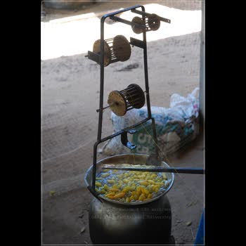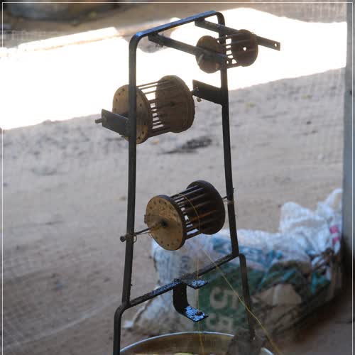 | คำอธิบาย : เครื่องสาวไหม หรือ พวงสาวไหม เป็นอุปกรณ์ที่จะช่วยในการตีเกลียวเส้นไหมหลาย ๆ เส้นจากรังไหมที่ต้มในหม้อให้เป็นเส้นเดียวที่มีลักษณะกลมแน่น วิธีการใช้งานจะสอดเส้นไหมใส่ในรูตรงกลางของเครื่องสาวไหม แล้วพันไปตามรอก ซึ่งเครื่องสาวไหมรุ่นเด่นชัย 1 จะมีรอกอยู่ 2 ตัว เมื่อพันไปจนครบแล้ว เส้นไหมจะถูกตีเกลียวประมาณ 7-9 รอบ |