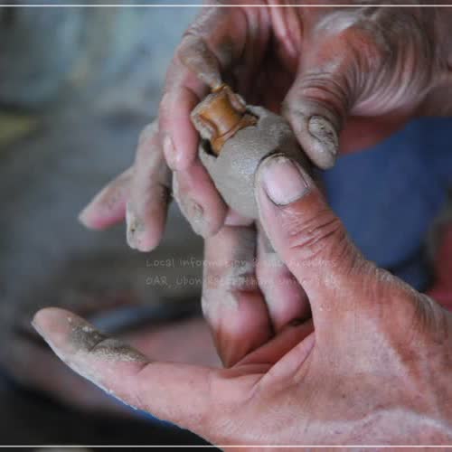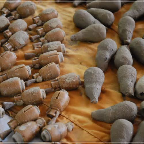 คำอธิบาย : การโอบเพชร หรือ การพอกดินรักษาลาย ในงานหัตถกรรมเครื่องทองเหลือง บ้านปะอาว จังหวัดอุบลราชธานี จะเป็นการใช้ดินพอกหรือห่อหุ้มรอบหุ่นขี้ผึ้งอีกชั้นหนึ่งเพื่อรักษาลวดลายไว้ โดยดินที่ใช้จะเป็นดินโพนผสมกับน้ำ ก่อนโอบเพชรการทำการติดสายชนวนที่หุ่นขี้ผึ้งก่อน โดยการนำเส้นขี้ผึ้งติดที่ส่วนใดส่วนหนึ่งของหุ่นขี้ผึ้งให้ยาวยื่นออกมา สายชนวนจะทำให้เกิดช่องทางสำหรับเทโลหะที่หลอมแล้วลงไปแทนที่ขี้ผึ้ง โลหะหลอมจะไหลไปส่วนต่าง ๆ ได้สะดวกถึงกันตลอดชิ้นงาน ทำให้ได้งานหล่อที่สมบูรณ์ไม่มีรูพรุน ไม่บิ่น ไม่แตก ถ้าชิ้นงานมีขนาดเล็ก เช่น กระพรวน จะติดสายชนวนรวมไว้ด้วยกัน เรียกว่า การติดแซง หรือ หรือการติดพวง |