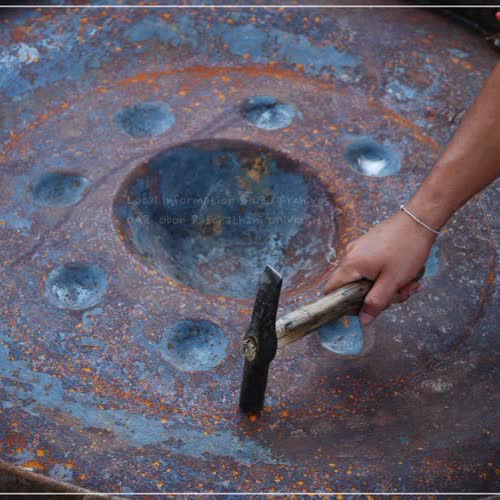 | คำอธิบาย : หัตถกรรมการตีฆ้อง บ้านทรายมูล อำเภอพิบูลมังสาหาร จังหวัดอุบลราชธานี จะเริ่มจากการตีขึ้นรูปจูมของฆ้องก่อน โดยใช้ค้อนตีส่วนกลางหน้าฆ้องให้นูนขึ้น ถ้าเป็นฆ้องขนาดใหญ่ตีบนพื้นดินที่ขุดหลุมไว้ แต่ถ้าเป็นฆ้องขนาดเล็กจะตีกับไม้หมอนที่เจาะร่องเป็นวงกลมไว้แล้ว หรือเรียกอีกอย่างว่า \"เบ้า\" กล่าวคือมีทั้งเบ้าดินและเบ้าไม้ หัวค้อนที่ใช้ตีจะมี 2 ลักษณะ ด้านหนึ่งจะใช้ตีให้นูน อีกด้านหนึ่งจะใช้ตีจิกให้เป็นร่องจากนั้นตีเพื่อไล่เสียงหรือทำให้ฆ้องเกิดเสียงโดยใช้ค้อนตีไปบนฆ้อง ซึ่งจะสังเกตเห็นได้ว่าจะเป็นรอยหัวค้อนเต็มไปหมด ระหว่างตีก็จะยกฆ้องขึ้นแขวนแล้วใช้กำปั้นทุบตรงจูมกลาง เพื่อทดสอบดูว่าเกิดเสียงหรือได้เสียงทุ้มกังวานตามที่ต้องการหรือยัง ฆ้องที่มีเสียงดีเมื่อตีแล้วจะดัง \"โมง\" ยาว ๆ เวลาตีส่วนใหญ่จะเข้าไปตีในป่า เพื่อลดมลภาวะทางเสียงที่จะรบกวนคนในชุมชน |